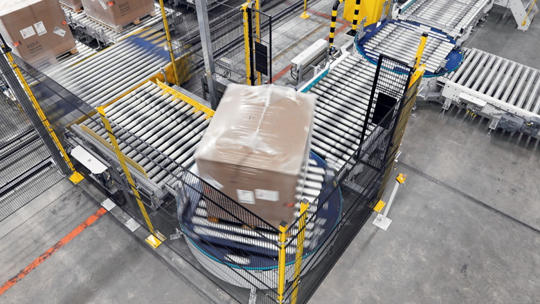 Combined with fully automatic pallet packaging systems, MSK pallet conveyors act as an integrated transport system. Particularly for conveying to packaging lines, precise positioning of the transported unit saves costs by minimizing film consumption.